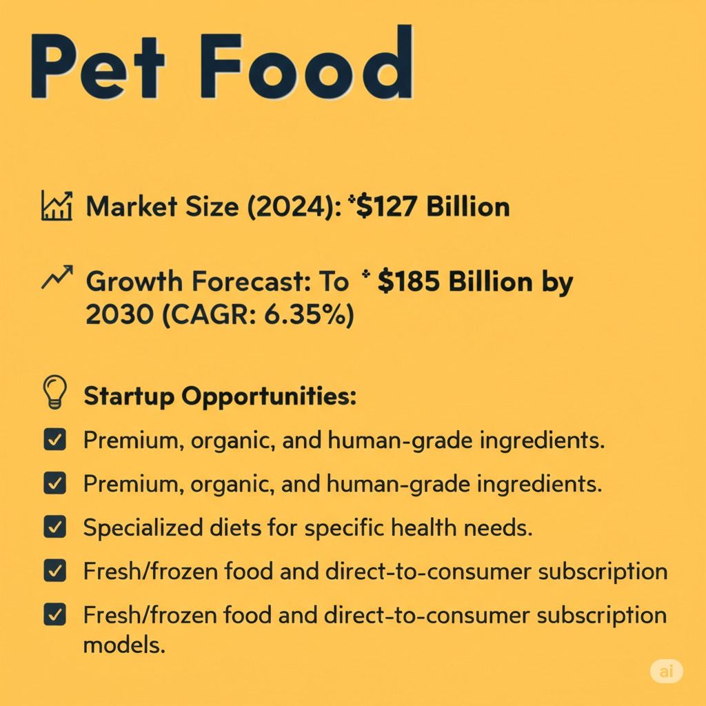 The global market for pet food is a well-developed and growing industry driven by the increasing humanization of pets and evolving consumer readiness to spend on specially designed and high-quality nutrition. The market size is estimated to be around USD 130.8 billion in 2024 and is expected to grow to USD 192.8 billion by 2033. This represents a Compound Annual Growth Rate (CAGR) of roughly 5.8% yearly from 2025 to 2033. Major trends and drivers include humanization of pets, premiumization, expanding e-commerce business, and a focus on sustainability and functional, health-oriented ingredients. Start-up opportunities include niche formulations and pet food incorporating sustainable and novel proteins, direct-to-consumer (D2C) models, and specialized supplements.