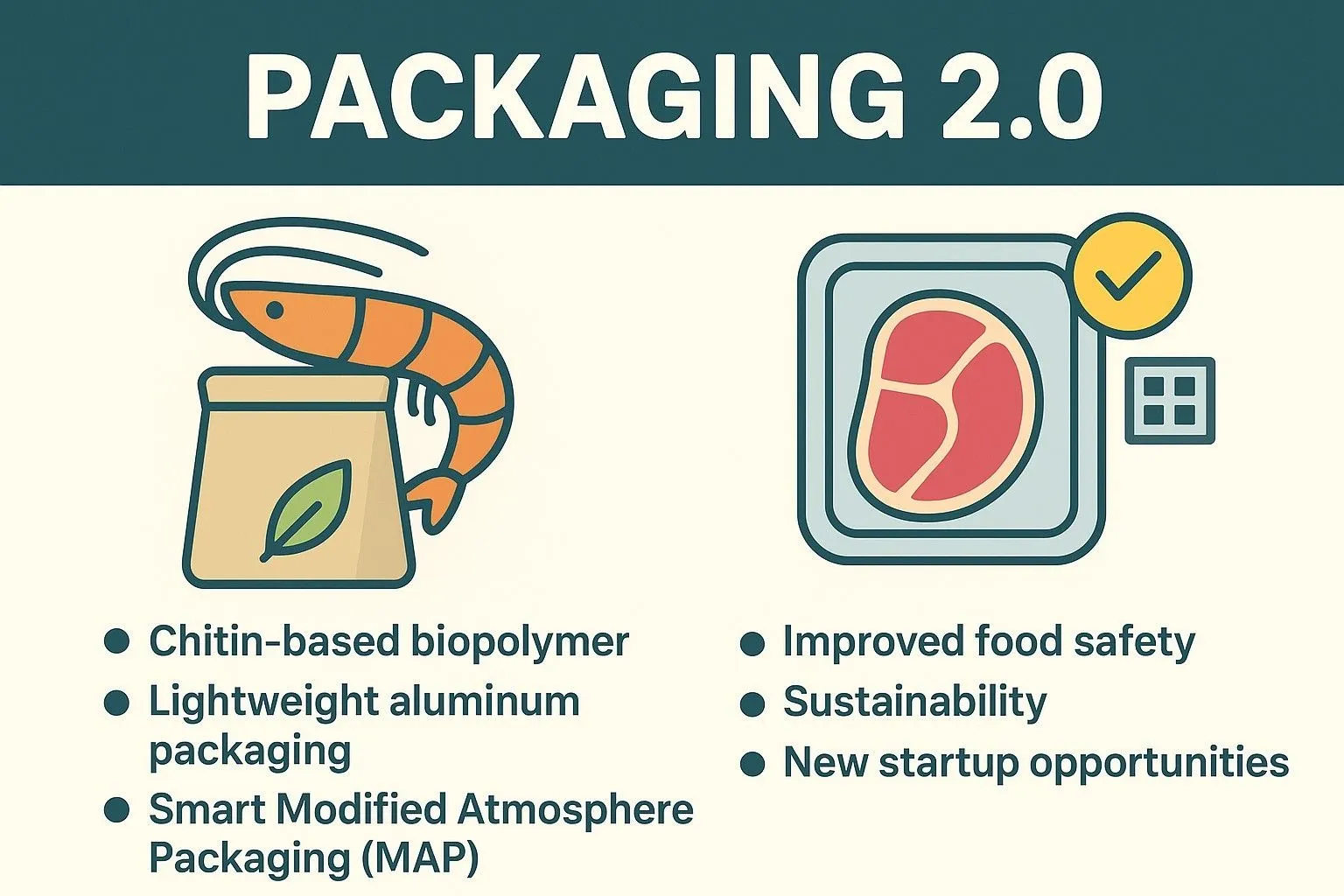 Aluminum and Chitin, three emerging technologies are proving to be true game changers — namely, chitin-based biopolymer packaging, lightweight yet durable aluminum packaging, and smart systems such as Modified Atmosphere Packaging (MAP). Together, these innovations mark the dawn of Packaging 2.0 — a decisive shift away from conventional plastics towards intelligent, eco-friendly, and high-performance solutions. Ultimately, this transformation is creating new startup opportunities across the entire value chain.
